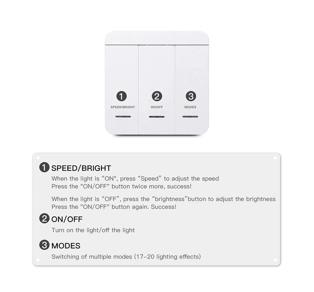 Контролер має 28 динамічних режимів, з найпоширенішим сценарієм — це послідовне вмикання всіх ділянок стрічки та послідовне вимкнення стрічки, яке створює вигляд смужки світла, що біжить. Є можливість керування яскравістю стрічки в статичних режимах і швидкістю мерехтіння в динамічних режимах. Корпус контролера виготовлений у формі мініатюрного приймача, що дає змогу встановити його в практично будь-якому місці. Контролер зберігає останню програму після вимкнення живлення.