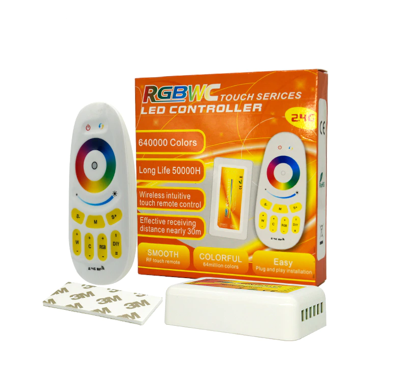 RGBWC контролер 2.4G 30А (6 на канал), призначений для керування повноколірними світлодіодними стрічками RGBWC LED Strip (5 кольорів в 1 чипі), це дає змогу з легкістю отримати Натуральний Білий (Nature White), під час спільного світіння двох білих квітів кристала. Також можна під'єднувати окремо RGB і одноколірну білу/теплу стрічку та регулювати кожну окремо. Цей контролер обладнаний функцією для плавного регулювання яскравості світіння світлодіодної стрічки в діапазоні від 1% до 100% з використанням широтно-імпульсної модуляції (ШІМ). Регулювання яскравості здійснюється за допомогою радіо пульта та має радіус дії до 30 м. Запам'ятовує останню програму після вимкнення живлення.